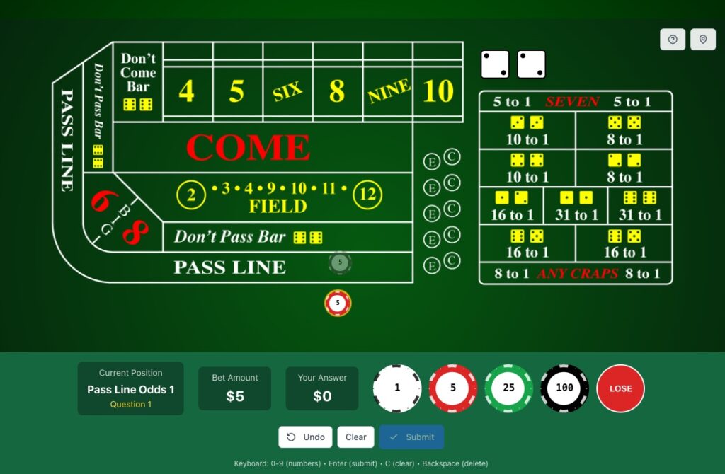 View the displayed dice outcome and bet amount on the authentic casino felt table, mentally calculate the correct odds payout (including 2x, 3x, 4x, 5x, and 10x odds), and enter your answer using the convenient number keypad. Get instant feedback on each attempt with visual confirmation and accuracy tracking throughout your session.