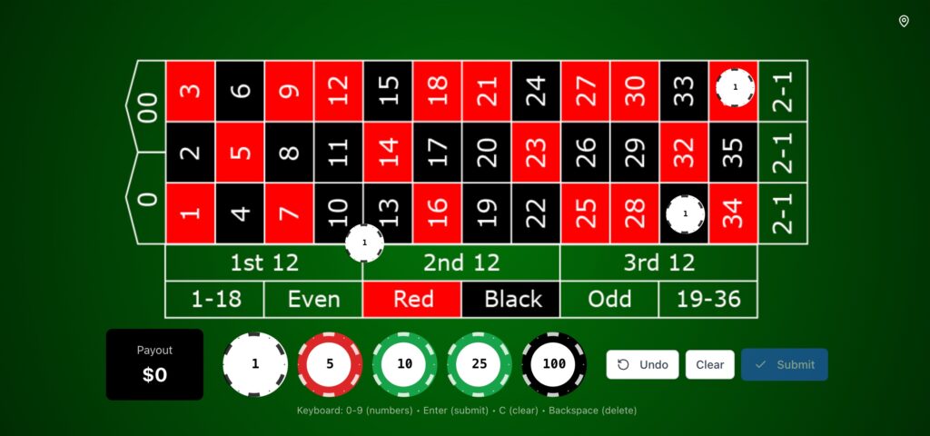 View the displayed winning number and bet placement on the authentic casino felt table, mentally calculate the correct payout (including straight-up 35:1, split 17:1, street 11:1, corner 8:1, and all outside bets), and enter your answer using the convenient number keypad. Get instant feedback on each attempt with visual confirmation and accuracy tracking throughout your session.